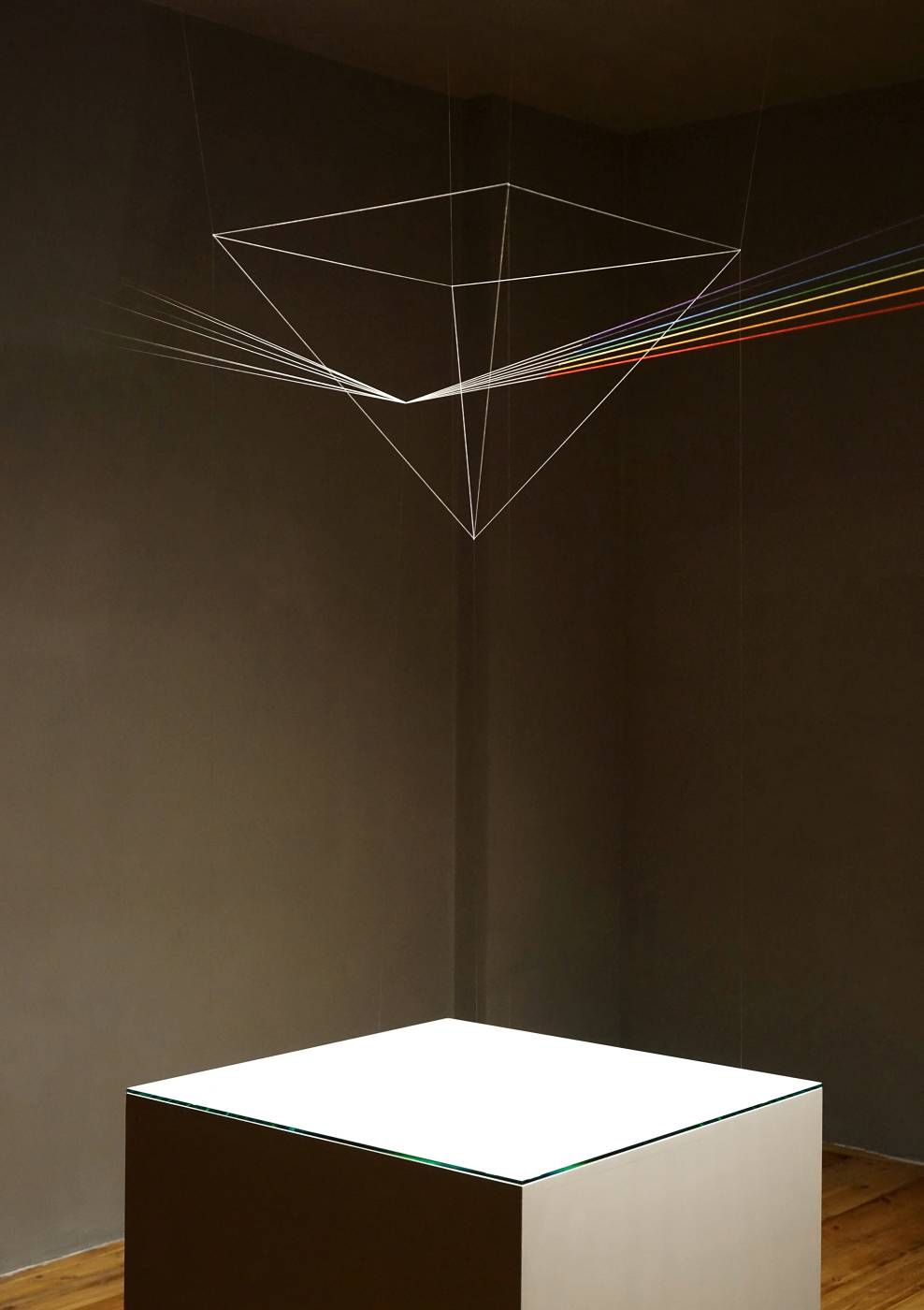 Christoph Zwiener, Berliner Künstler, knüpft aus den Fäden transparente Installationen, die im Raum eine unwirkliche und flüchtige Form annehmen und dennoch Abbildhaftes materialisieren.